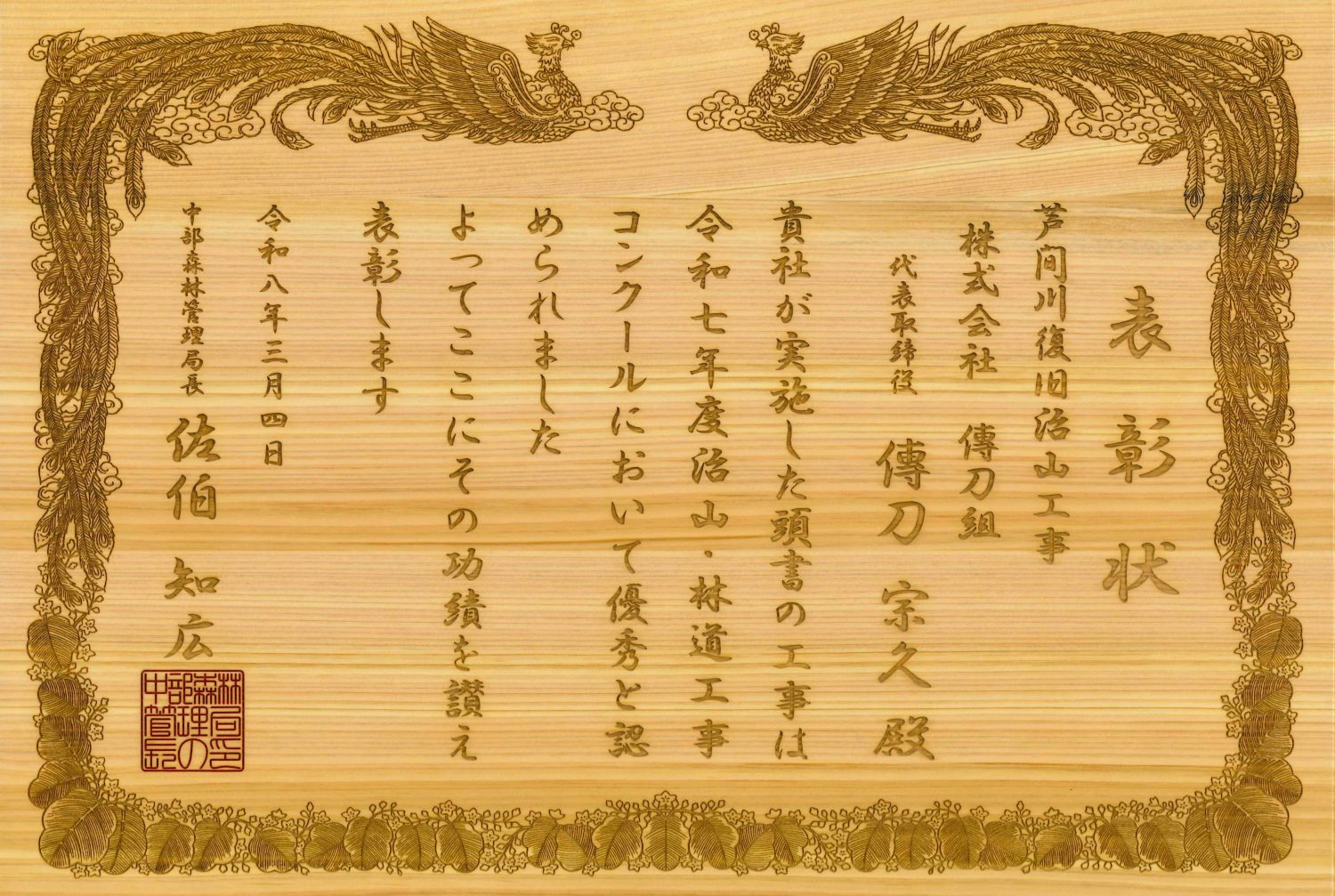 この度、中部森林管理局より当社土木事業受注工事「芦間川復旧治山工事」が表彰されました。